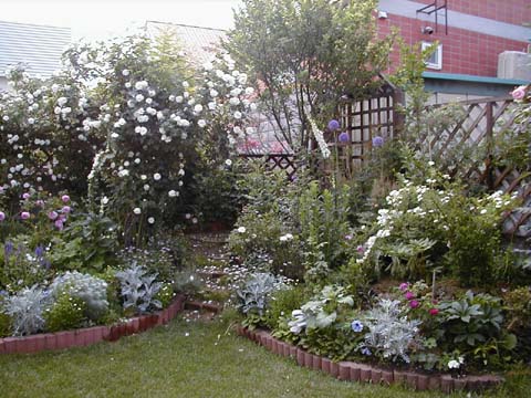 ここはお隣の北側にあたり、南側とはいいながらわが家では日陰がちの場所。丈夫で日陰にも強い薔薇を今少しずつ育成中です。右中央の白薔薇は”群星”。右下の赤紫はRose de Rescht。奥のトレリスのピンクはCoral Dawn。トレリス中央には”紅霞”を這わせていますが、遅咲きなので咲くのはこれからです。