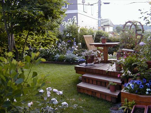 ウッドデッキを東のアーチから眺めた風景です。奥に見えるのが西の庭。左側のもみじが夏の朝、心地よい木陰をウッドデッキに作ります。