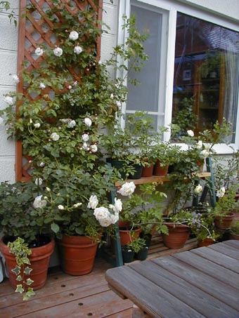 左のトレリスには丈夫なつる薔薇Baltimore Belleが花盛りです。