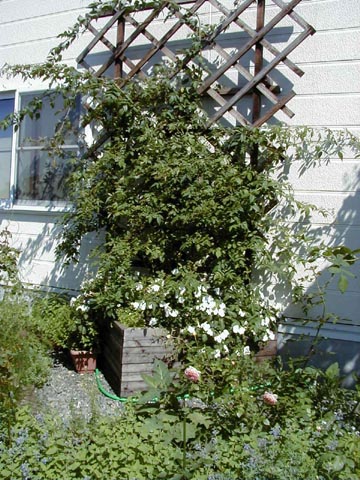 夫作製の木製プランターに家の壁を這わせているツルバラ、Paul's Himarayan Muskを植えました。バラはぐんぐん育っているのですが、まだまともに花を見ていません。降るように咲くポールを見たい!この大物トレリスは私の作品です。苦労しました。