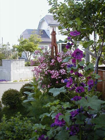 もともとはハーブ園だった西の庭に今やどんどん薔薇が進出しています。このモーツァルトは秋田から始まりパソコン仲間の間で広がっているファンの多い薔薇。これも九州の方からいただいたものです。古代紫の絞り模様のような咲き方が、着物の柄を思わせる奥ゆかしい風情です。薄紅葵との愛称もばっちり!