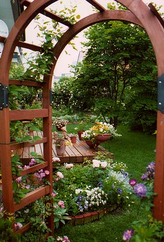 西のアーチからウッドデッキや奥のオールドローズガーデンを眺めたところです。庭には黄色の花を植えていないのですが、実はアプリコット色が大好きな私。デッキの上にはアプリコット色の薔薇や花々を集めてうっとりしています。