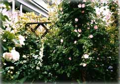 | 本州の方ではつる薔薇のように育つBallerinaですが、北海道ではなかなか大きくなりません。繰り返し咲く涼しげなピンク色は夏中ガーデンに色どりを添えてくれます。 |