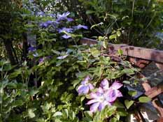あるときお店の裏で他のクレマチスとからみあって咲いているこの花が目に留まりました。なぜかその時は私好みの紫色の花を咲かせていたように思うのですが。その後はご覧のとおりの鮮やかな赤紫が咲くばかりで最初はがっかり。でもいまでは「バラ色のクレマチス」と呼んで咲くのを楽しみにしています。