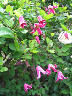 釣り鐘状の小ぶりの花が風に揺れている姿は、とってもとってもかわいいです。紫系の多いわが家では珍しい濃いピンクのクレマチス。通りかかるたび、あらと足を止めてしまいます。