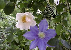 これは表紙写真でおなじみの2ショットです。ほんのりアプリコット色のイングリッシュローズ・シュロップシャーラスと、ほんのり藤紫色の藤娘がなんて似合っていることでしょう。どちらも私の大好きな花。最近はシュロップシャーラスが大きく育ってきたために、樹高1.2mくらいの藤娘はかわいそうに背伸びしないと一緒に並べなくなってしまいました。 |