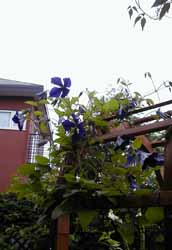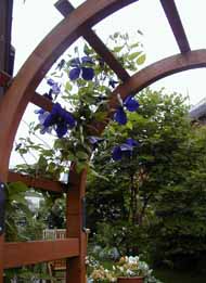 このアーチには紫薔薇ファイルヘンブラウとラベンダードリームが這わせてあります。紫の薫るアーチをめざして、さらにジャックマニーを植えました。これは正解!よく伸び、花の時期も長く、思惑どおりの出来映えになりつつあります。(?)