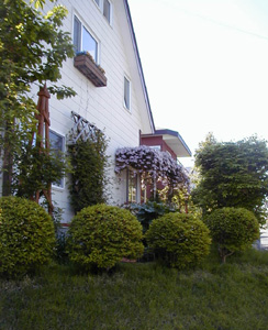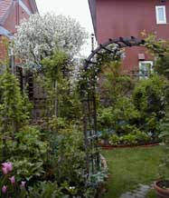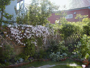![]() | 春一番、眠っていた庭に生気を吹き込もうとするかのように ヒメリンゴの花が満開に。そして早咲きのクレマチスが遅れてはならじと それに続きます。やっとアーチを彩るほどに育ったアルピナ・ウィリー。 東のトレリスを覆い隠すモンタナ・エリザベス。 西のモンタナ・ルーベンス。 どの花も桜色の春霞のように満開に咲き誇り、 遅い春の訪れを告げてくれます。 | ◆◆◆ |