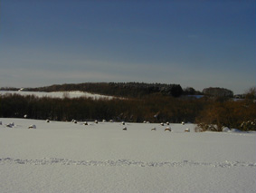 ![]() | * 雪の牧草地と牧草ロール 我が家の裏手に広がる丘は 夏は黒牛が草をはむ牧草地。 |