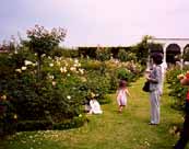 ◆ 園内は広く、子供が飛び回っても薔薇の木を痛める心配がないくらいの広い通路がとってあり、ポール仕立て、アーチ仕立ての立体的な薔薇園の脇には、中央に縦長の池と噴水を配した開放的なオープンスペースの薔薇園があります。最新作の薔薇、まだ試験的に植えられている薔薇が見られるのもここ。薔薇の木はのびのびと自然に大きく育てられ、いろいろな薔薇の香りを確かめられます。 |