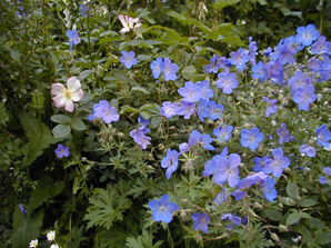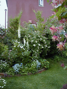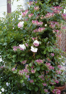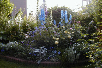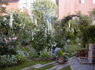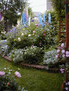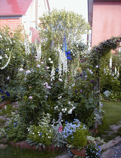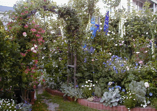 ピンク系の薔薇も薄い色合いのためかこの時期の庭は、 ホワイト&ブルー・ガーデンになります。 |