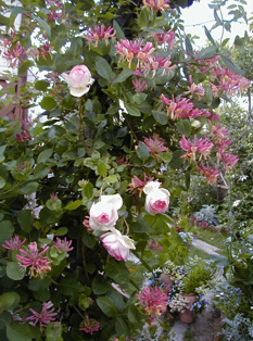 アーチにからませた鉢植えのピエールドゥロンサール。 今年は主役を奪われてがっかり(?!) でも本当は主役は私!と思っているかも。 |