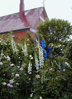 背の高い花々は庭を立体的に見せてくれます。 我が家の定番、白のフォックスブローブに 今年はデルフィニウムが立派に育ってくれました。 |