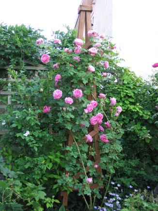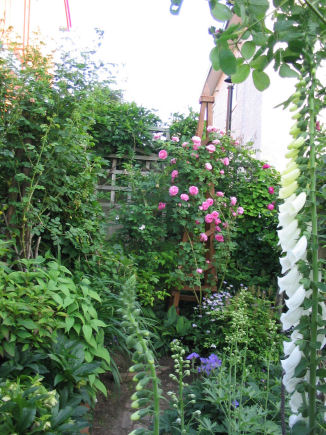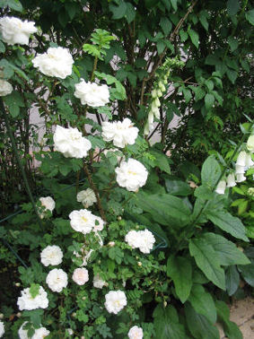 Stanwell Perpetual。 よく伸びてパーゴラの柱に 寄り添ってくれました。 | 白のフォックスグローブともよくお似合い。