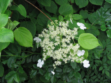 日陰に強いというツルアジサイが初開花。 日陰を彩ってくれる日を気長に待って いましたが、まさか8年かかるとは! |