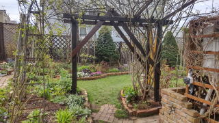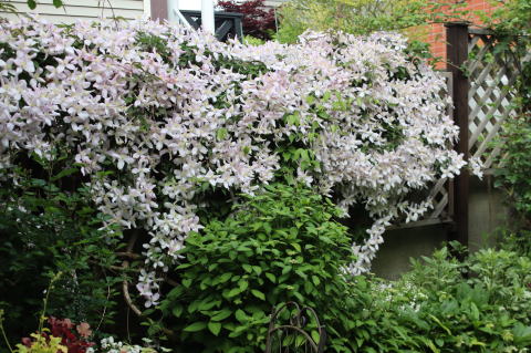 肝心の庭はというと、このとおり。まだやっとクレマチス・モンタナが咲き始めたばかり。