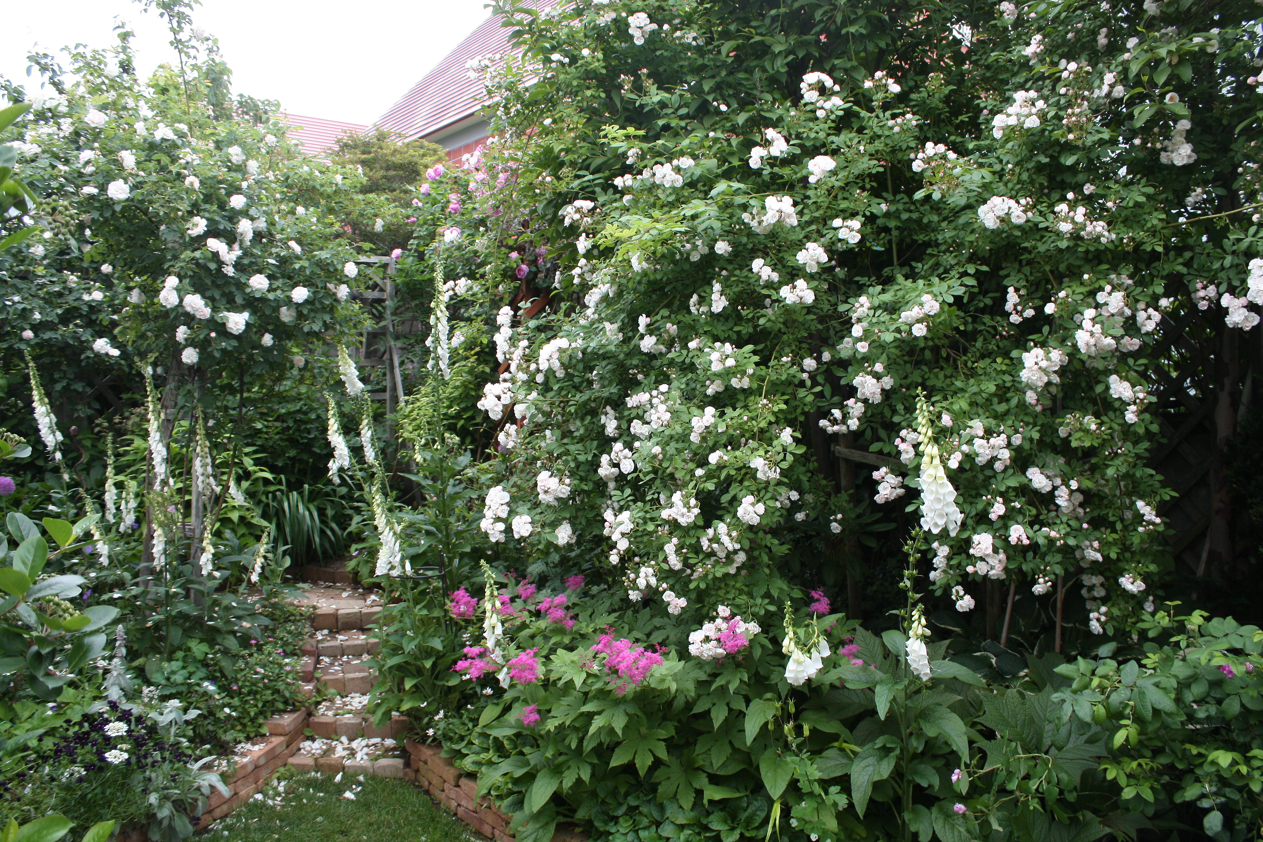 レンガの土留めに沿って、上段も下段もボーダー・ガーデンになっていますが、背景の家の壁で、ヒマラヤンムスクがみごとに育ってくれました。
