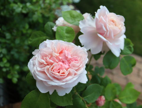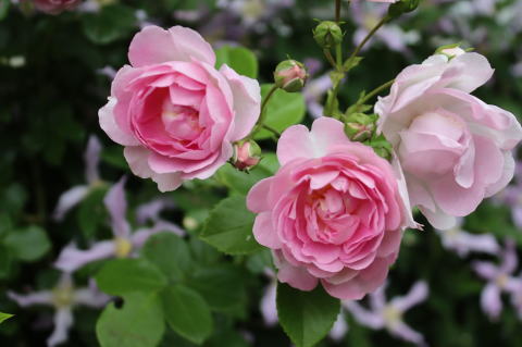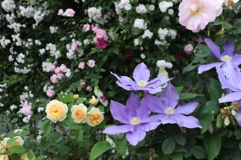 ガーデンシェッド前の庭には、その昔、このサイトの扉写真に採用したお似合いの取り合わせ、ERのシュロップシャー・ラスとクレマチス’藤娘’を植えています。