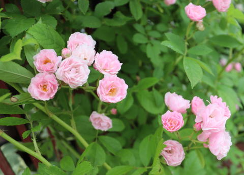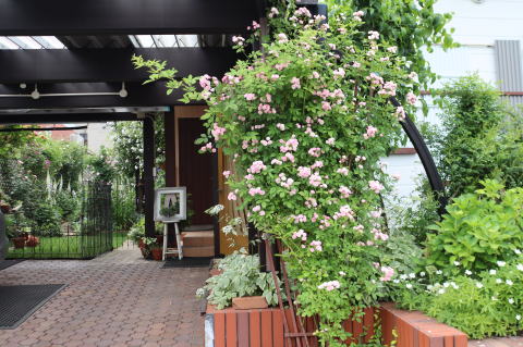 迫力のある樹形ですが、この小ぶりなピンクなら、さわやかなウェルカム・ローズになってくれそう。