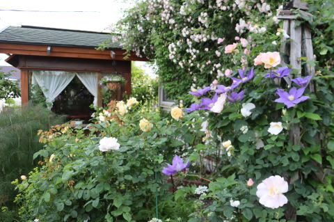 その前、5月6日にはアーチも完成させてました! アーチの外側からヒマラヤンムスクに押されて傾くため、ヒマラヤンムスクをアーチの内側にしてしまった夫の斬新な設計。 この発想もおみごと! |