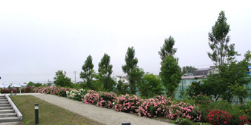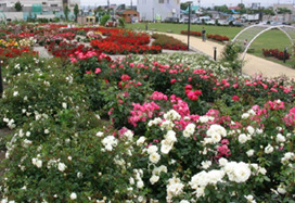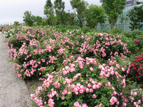 はぼろバラ園全景 7月中旬の最盛期 この水路の左手奥には オールドローズガーデンがあります。 オールド系はやや早め、 7月上旬が見頃。 |