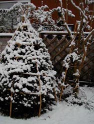 ![]() | オールドローズはつるばら扱いで、 根曲がり竹で横倒しにして雪囲いしています。 |