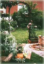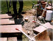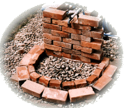 ![]() | 古レンガを積んで仮完成。一冬越して地盤が安定したらモルタル仕上げをします。緑濃い花の季節になり、レンガの水場が庭にしっくりとけ込みました。 | ![]() |