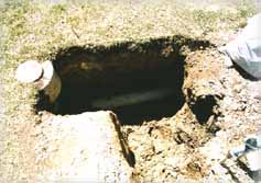 ![]() | 台所の下水管を掘り当てます。 この穴掘りはせめてもと、 私がしました。普段薔薇を 植えるための穴掘りで鍛えて いるからね〜。 |