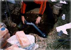 ![]() | はめ込んだ後、水漏れしないよう ていねいに接着します。この 作業が一苦労。下水の匂い に耐えながらの穴蔵仕事です。 |