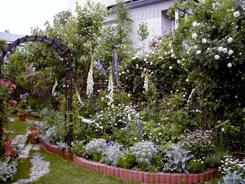 Old rose garden, a north view. Roses are beginning to bloom. Behind the east arch, the path of railway sleepers.