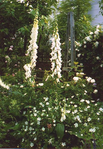 Behind, Alba Maxima. On the obelisk, Madam Hardy. I grow Foxgloves alba from the seeds every year.