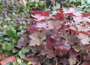 The foliage of this Heuchera (front) is dark red. A little different as black plants? The foliage of Ajuga (behind) is really black in a shady garden. The blue flowers are also very beautiful. |