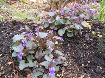 | Viola labradorica purpurea has a chic black foliage. The one between Violas is Black dragon beard (Ophiopogon planiscapus). | The spring black color of Viola labradorica purpurea changes into green in summer. |