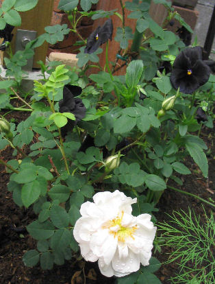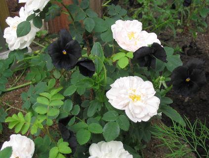 | Black pansies are good companion plants to the little flowers of Stanwell Perpetual. |