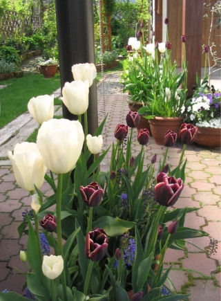 Black tulips are typical of black flowers. They are so fantastic! Front black tulips are Tulipa cv. Jackpot. | Black tulips in the behind pots are Queen of the Night. The blue flowers underneath are Muscari. |