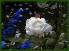 English rose, Redoute. Blue flowers are S. guaranitica.
