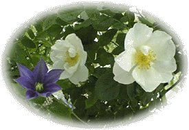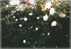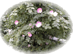 | 花も葉っぱもリンゴの香り。ヨーロッパの野薔薇だけあってよく伸びること伸びること。秋には細長いオレンジ色の実をたわわにつけます。 | ![]() |