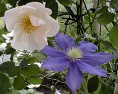 これは表紙写真でおなじみの2ショットです。ほんのりアプリコット色のイングリッシュローズ・シュロップシャーラスと、ほんのり藤紫色の藤娘がなんて似合っていることでしょう。どちらも私の大好きな花。最近はシュロップシャーラスが大きく育ってきたために、樹高1.2mくらいの藤娘はかわいそうに背伸びしないと一緒に並べなくなってしまいました。 |