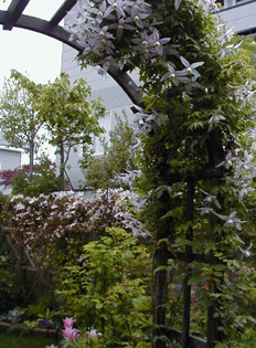 ![]() | 春一番、眠っていた庭に生気を吹き込もうとするかのように ヒメリンゴの花が満開に。そして早咲きのクレマチスが遅れてはならじと それに続きます。やっとアーチを彩るほどに育ったアルピナ・ウィリー。 東のトレリスを覆い隠すモンタナ・エリザベス。 西のモンタナ・ルーベンス。 どの花も桜色の春霞のように満開に咲き誇り、 遅い春の訪れを告げてくれます。 | ◆◆◆ |