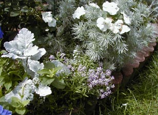 Viola on the photo grew naturally. Petunia, Prime time light blue | Most of them survive winter of Hokkaido. Artemisia Powis Castle (behind) and Dusty Miller (front) are my favorites. |