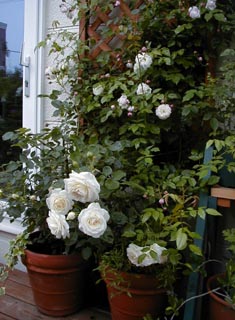 The purple shade of Veilchenbau appeared at last on the one side of the west arch. | So I put Pierre de Ronsard grown in pot every year. |