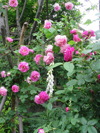 I'm fond of pink color. Front rose: Fantin Latour. Center pink rose: Celsiana. |