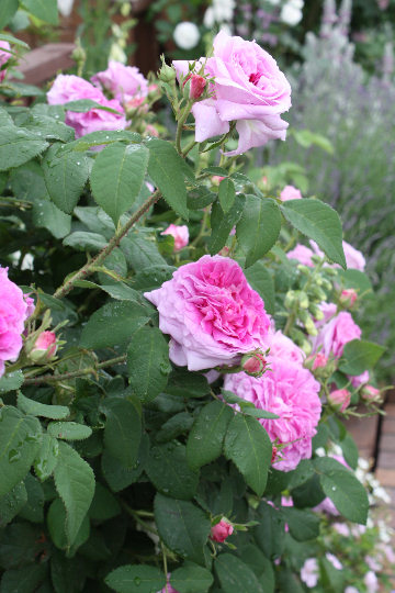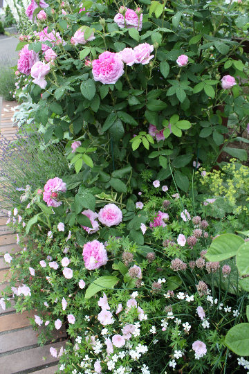 President de Seze The center of the flower is deep lavender pink. This rose becomes the accent of the romantic garden. At the foot of the rose, the pink flower is a geranium, which was presented by my neighbbor. The little white flower is a fringed pink, which I grew from seeds. |