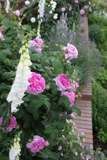 West Border Garden President de Seze from the south The front white rose is Boule de Neige. The rose at the back is Comte de Chambord. |