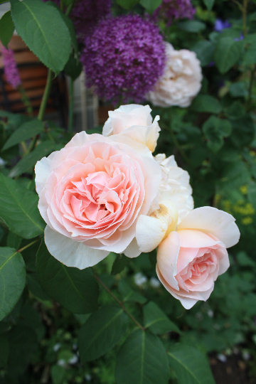ER Sweet Juliet The apricot pink of Sweet Juliet is so attractive. The fragrance is fluity and also the flower shape looks like some fruit. It matches purple, blue and yellow color flowers well. The tall purple flower is Allium giganteum. The lower yellow plant is a herb, Rue. |