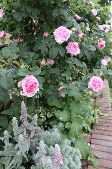West Border Garden Konigin Von Danemark from the north The rose at the back is Jacques Cartier. The plants with silvery leaves are Lamb's-ear (front) and Artemisia schmidtiana. The green and yellow plant is Vinca. |
