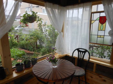 当初は作業小屋の予定だったのですが、友人からおしゃれなステンドグラスや家具をもらうことになり、「小屋」からグレードはどんどんエスカレート。レースのカーテンが付いた頃には、もうここでプランターの土仕事や大工仕事をする場所という目的は消え果てました。楽しくお茶会、地域交流、友人交流の集いの場となり、それはそれで大活躍です。