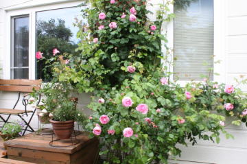 ガーデンシェッド窓の前にあるピンクの薔薇は、Raubritter。