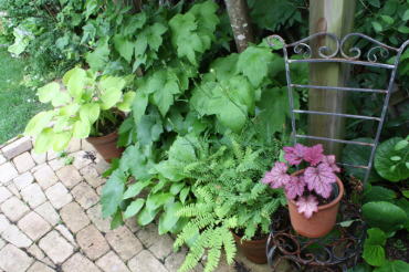 日陰の庭なので、シダ類やヒューケラを並べて。