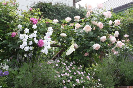 6月末から咲き始めたER Kathryn Morley。シェッドが出来て、冬場の吹きさらしから守られたのか、この年例年以上の花つきでした。
